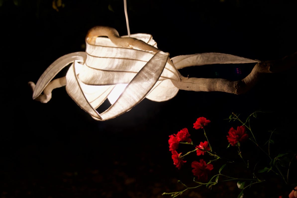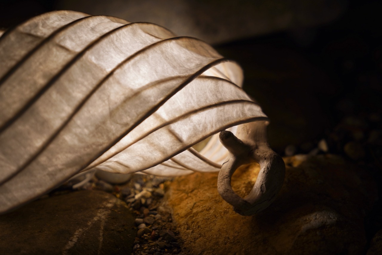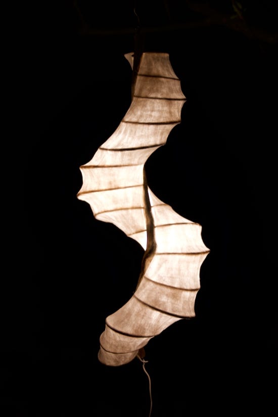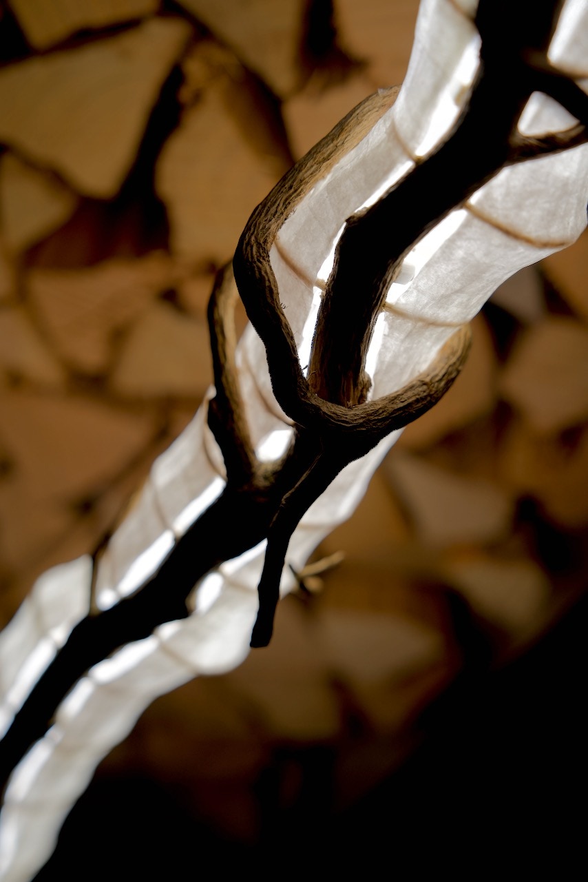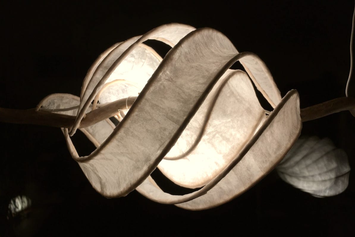 Nun bekommt das Skelett einen Überzug aus unzähligen Seidenpapierschnipseln, die schichtenweise miteinander verleimt werden. Dieser Arbeitsschritt nimmt sehr viel Zeit in Anspruch, ist aber trotzdem spannend, weil dabei Schritt für Schritt die Form der Lichtskulptur zum Vorschein kommt.