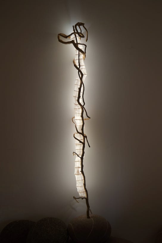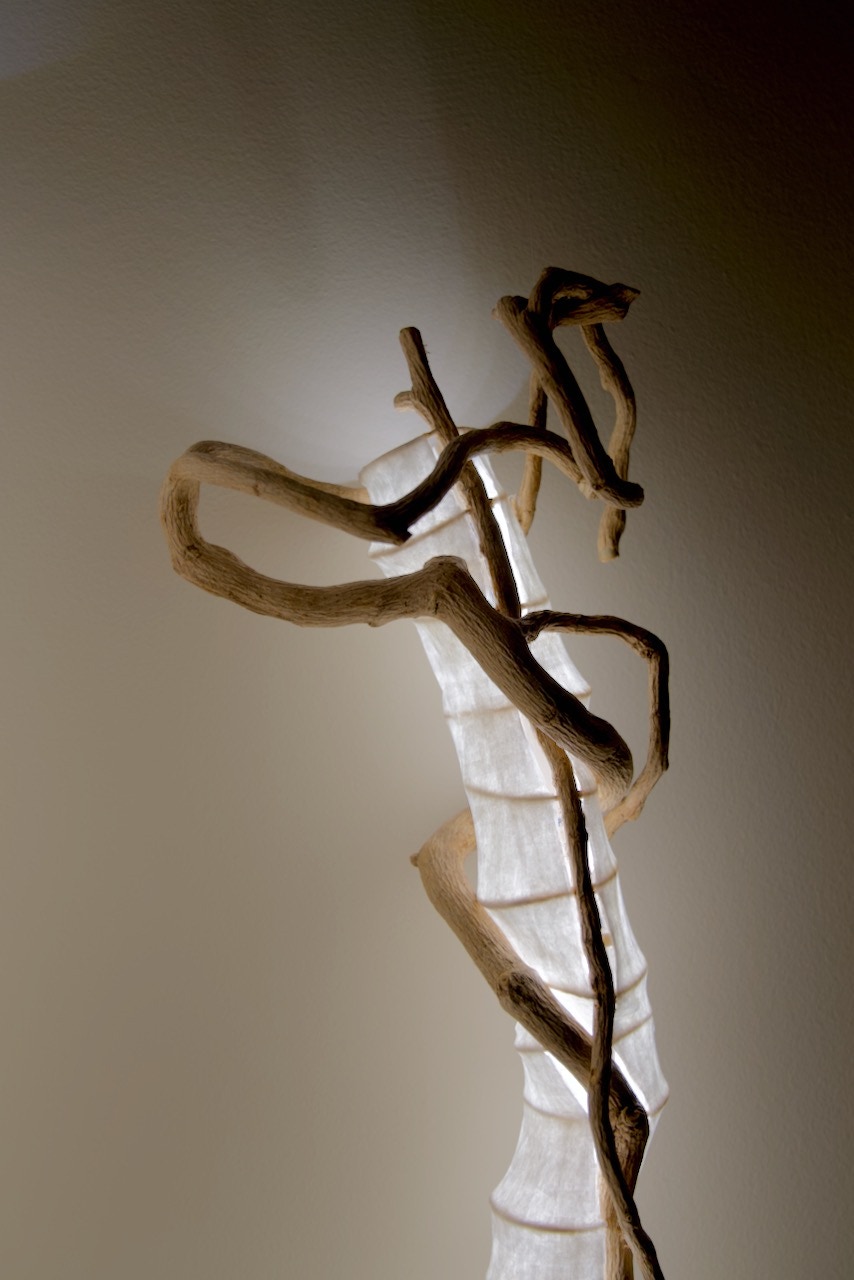 Das Schwemmholz nutze ich als Rückgrat und erweitere die Form mit Peddig- oder Klopferrohr zu einem Skelett. Dabei lasse ich mich einerseits von der Form des Fundstücks und andererseits von organischen Formen aus der Natur inspirieren.